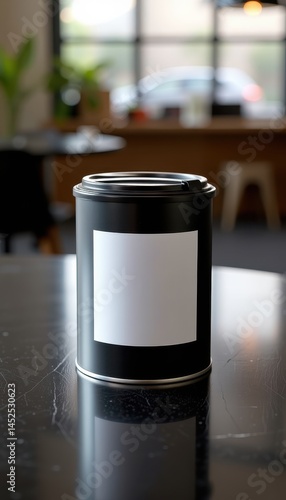 matte black coffee tin mockup with blank label on a dark reflective table and bright minimal cafe background connecting product to urban beverage culture