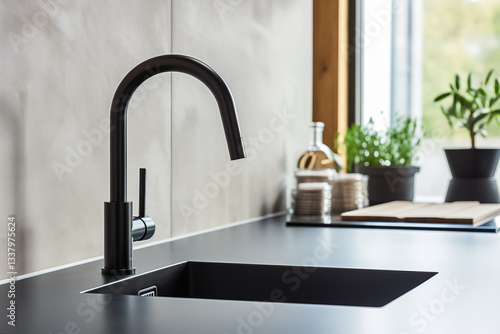 Matte black modern kitchen faucet with a sleek curved design. This stylish faucet adds contemporary touch to kitchen interiors with its minimalist structure.