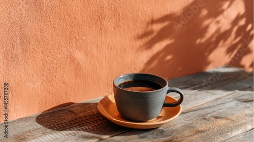 Matte ceramic cup holds dark coffee, resting on rustic wood. The warm sunlight casts soft shadows from the orange plaster wall, providing a cozy ambiance