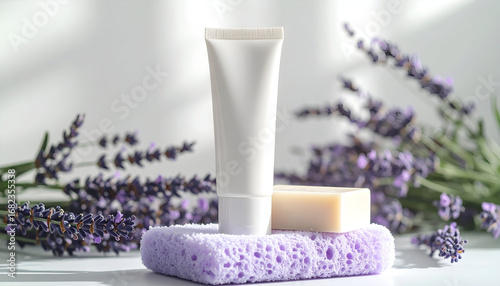 Matte Cream Tube with Lavender and Soap on Loofah Sponge