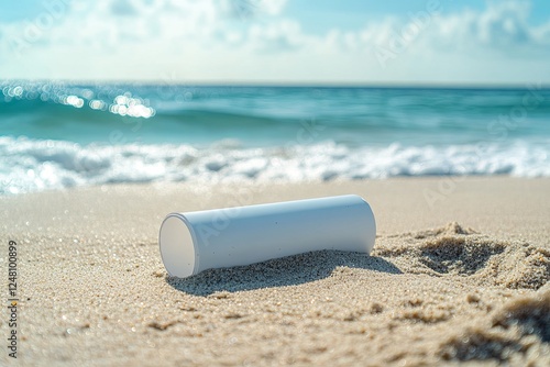 Matte white tube partially buried in soft beach sand, bright sunny backdrop