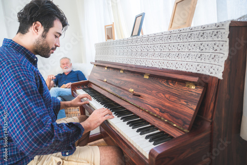 Mature and senior man with grey hair singing at home with eyes closed having young and handsome son play music and tune on piano