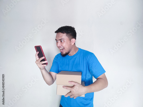 Mature Asian man smiling happily while looking at smartphone screen while holding package box