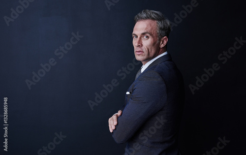 Mature, businessman and portrait in studio for pride, corporate project and attorney for law firm. Mockup space, male lawyer and arms crossed with legal aid for justice, court case or dark background