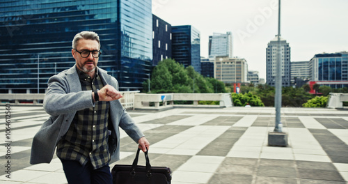 Mature, businessman and running late for commute for meeting as real estate agent in city. Male person, checking watch and realtor for transport, travel and career as property investment in Australia