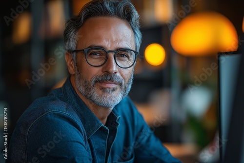 Mature Businessman Smiling Confidently in Office Workspace. Professional Portrait of a Middle-Aged Entrepreneur with Laptop and Glasses in Well-Lit Modern Interior