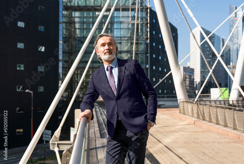 Mature businessman with hand in pocket standing by railing on sunny day