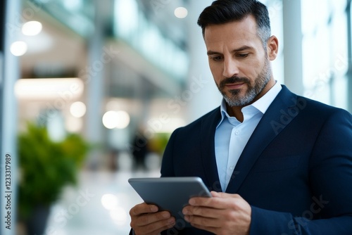 Mature caucasian male business professional using tablet in modern office environment