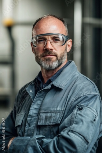 Mature caucasian male engineer wearing protective glasses and work jacket in industrial setting.