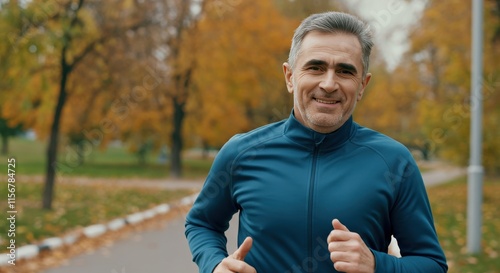 Mature caucasian male jogging in autumn park for healthy lifestyle and fitness