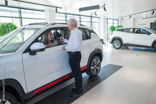 Mature Caucasian woman sits in a new car, an elderly man gives her the keys.