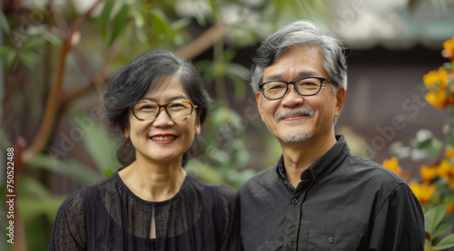 Mature, couple and portrait of a man and woman posing together for love, bonding and dating. Happy, Asian and romantic people radiating positivity outdoors for content, happiness and exploration