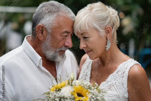 Mature couple enjoying a tender moment during an outdoor wedding ceremony in springtime