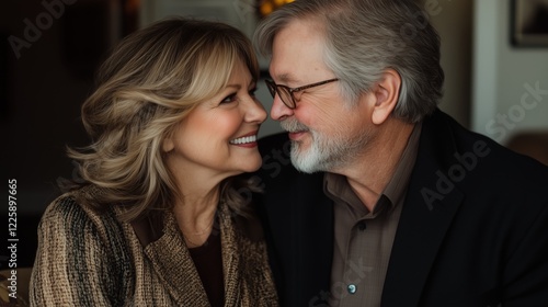 Mature couple smiles lovingly at each other, reflecting happiness in their retirement years while enjoying each other's company indoors