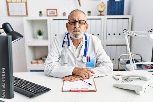 Mature doctor man at the clinic puffing cheeks with funny face. mouth inflated with air, crazy expression.