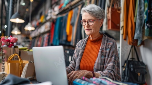 Mature female fashion seller using computer checking ecommerce clothing store orders. Older middle aged business woman entrepreneur working on laptop preparing online shipping delivery parcels boxes.