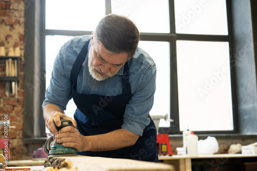 Mature handsome joiner work in carpentry. He is successful entrepreneur at his workplace.