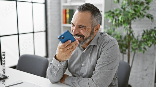 Mature hispanic man with beard laughing while holding a smartphone in a modern office