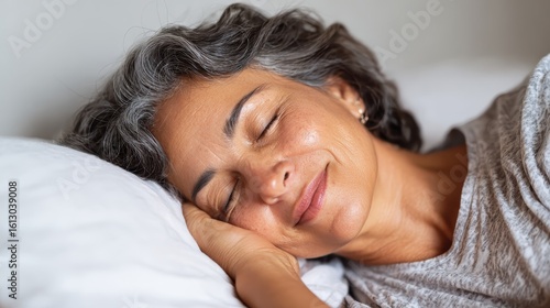 Mature hispanic woman resting peacefully, grey hair spread on pillow, soft smile reflecting tranquil sleep in warm, comfortable bedroom setting
