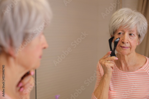 Mature lady using a tool to control her facial hair