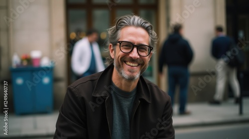 Mature Man Smiling Joyfully While Sitting on a City Street During a Sunny Day