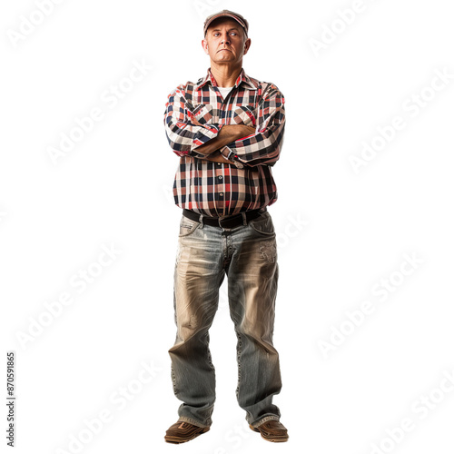 Mature man standing with arms crossed on a checkered transparent backdrop