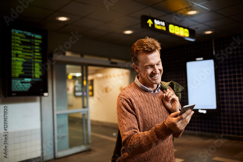 Mature man using a smart phone while waiting at a train station