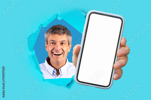 Mature man with a friendly smile peeking through a torn blue paper, presenting a smartphone