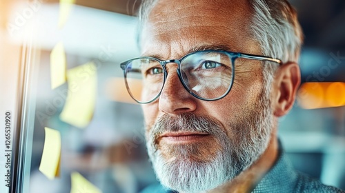 Mature man with glasses thoughtfully examining sticky notes in modern office environment during work hours