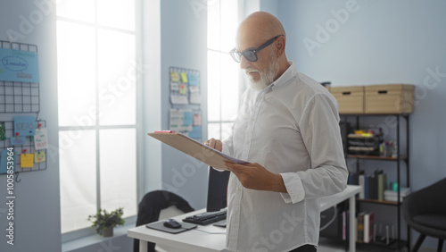 Mature man with grey hair and beard examines clipboard in modern workplace with sunlight streaming through office windows
