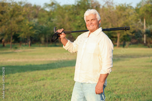 Mature man with walking poles in park, closeup