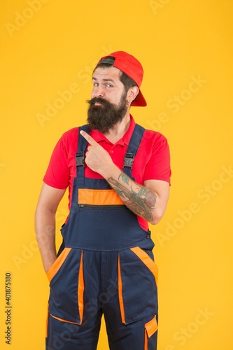 mature man worker with beard wear uniform, indicate announcement