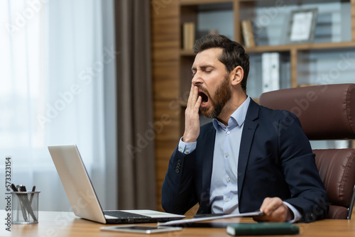 Mature man yawning inside classic office, senior businessman in workplace sleepless and overworked, boss in business suit sitting at desk, using laptop at work.