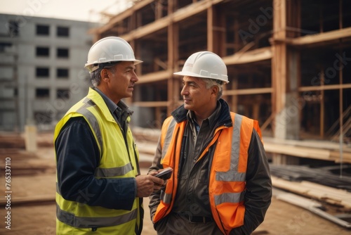 mature men building contractors wearing hat and safety suit discussing work project at construction building site