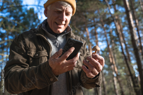 Mature mushrooms picker checking real mushroom with the picture at his smartphone