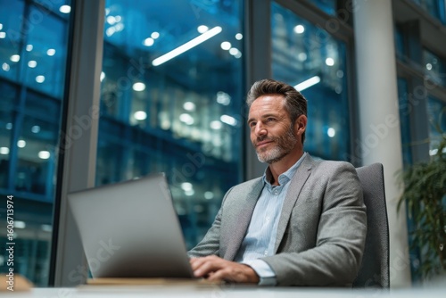 Mature professional man using laptop in modern office lounge, portraying remote work, business confidence, and digital productivity.