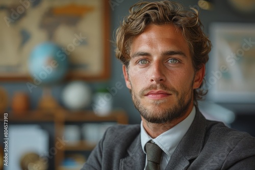 Mature professional man with an intense gaze sits confidently in a well-appointed office with a globe at the back