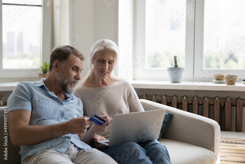 Mature spouses buy electronic services, order goods for home, e-commerce retail e-services happy clients, spend money on internet concept. Older couple use laptop and credit card make purchase online