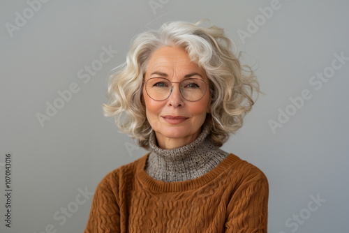 mature woman display a refined style that radiates confidence and grace, enhanced by a minimal background that highlights their healthy glow.
