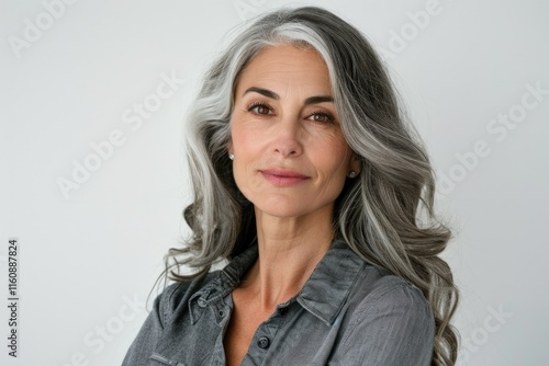 Mature woman in office attire with long gray hair.