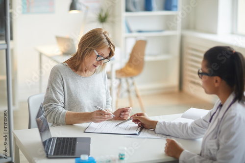 Mature woman sitting at the table and filling the medical card while female doctor sitting opposite her and pointing at document at clinic