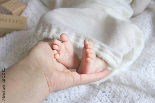 mature woman's hand is holding the tiny feet of a newborn baby