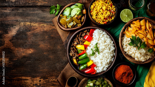 Mauritius independence day celebration with traditional cuisine. Horizontal banner. Copy space. Holiday food of Mauritius on a wooden table. Top view
