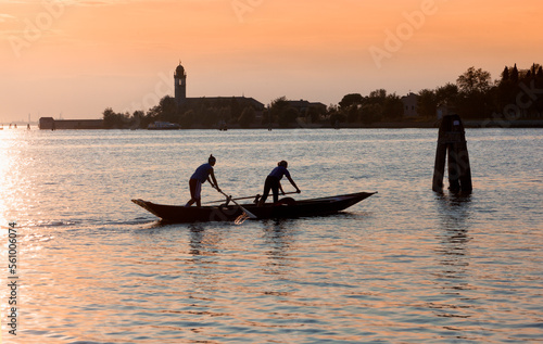 Mazzorbo, Venezia. Voga con sandolino sullo sfondo della Chiesa di Santa Caterina