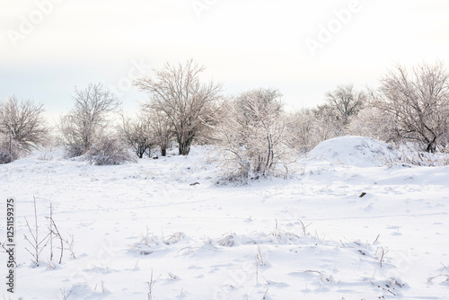 meadow covered with snow in winter, trees and branches covered with ice