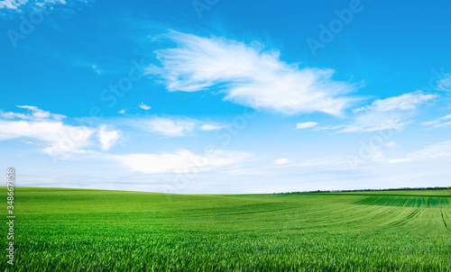 Meadow field wheat hill with white clouds and blue sky. Panoramic landscape