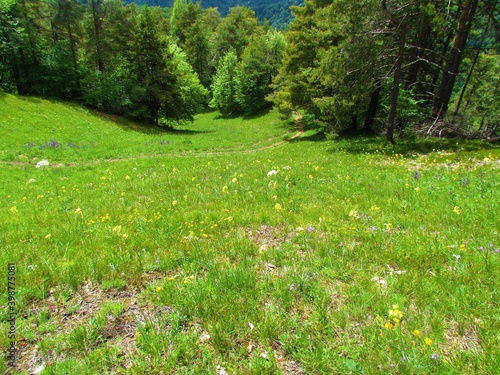 meadow with yellow flowers and a forest behind it in Slovenia