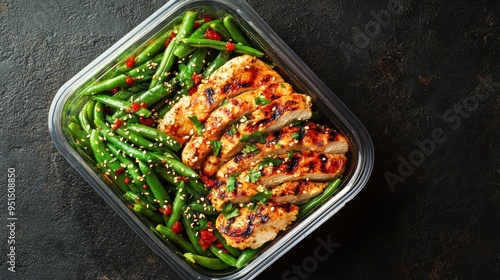 Meal prep container filled with grilled chicken and green beans, set against a dark, textured background. The meal is neatly arranged with vibrant green beans contrasting the golden chicken