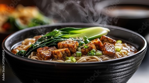 Meal Prep Made Simple with Plant-Based Protein concept. Steam Rising from a Delicious Bowl of Noodle Soup with Fresh Greens and Tempeh