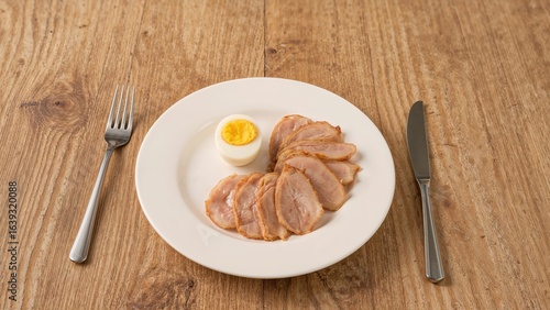 Meal setup featuring a boiled egg and sliced meat on the table.